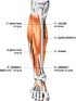 | Tibialis anterior | Tibia | Metatarsal # 1 (big toe) | Raises front of foot. | Lower leg- rear of human lower leg![]() |