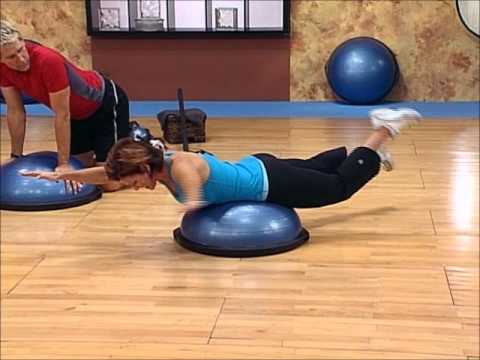 1. Inhale. Exhale. Tuck your chin into your chest and lift your head and shoulder blades off the bosu using your abdominals, stopping until your upper body forms a single straight line from chin to hips. It is not necessary for you to sit all the way up.