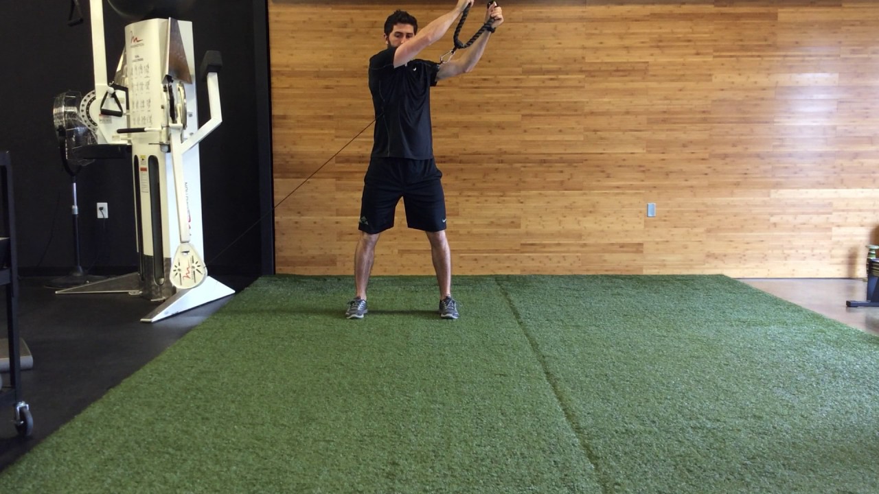 5. Use the hand that's closest to the pulley to lift the bar diagonally across the body, and stop when the other arm is fully extended. Slowly lower the bar back down, rest, and repeat for repetition completion before switching sides.