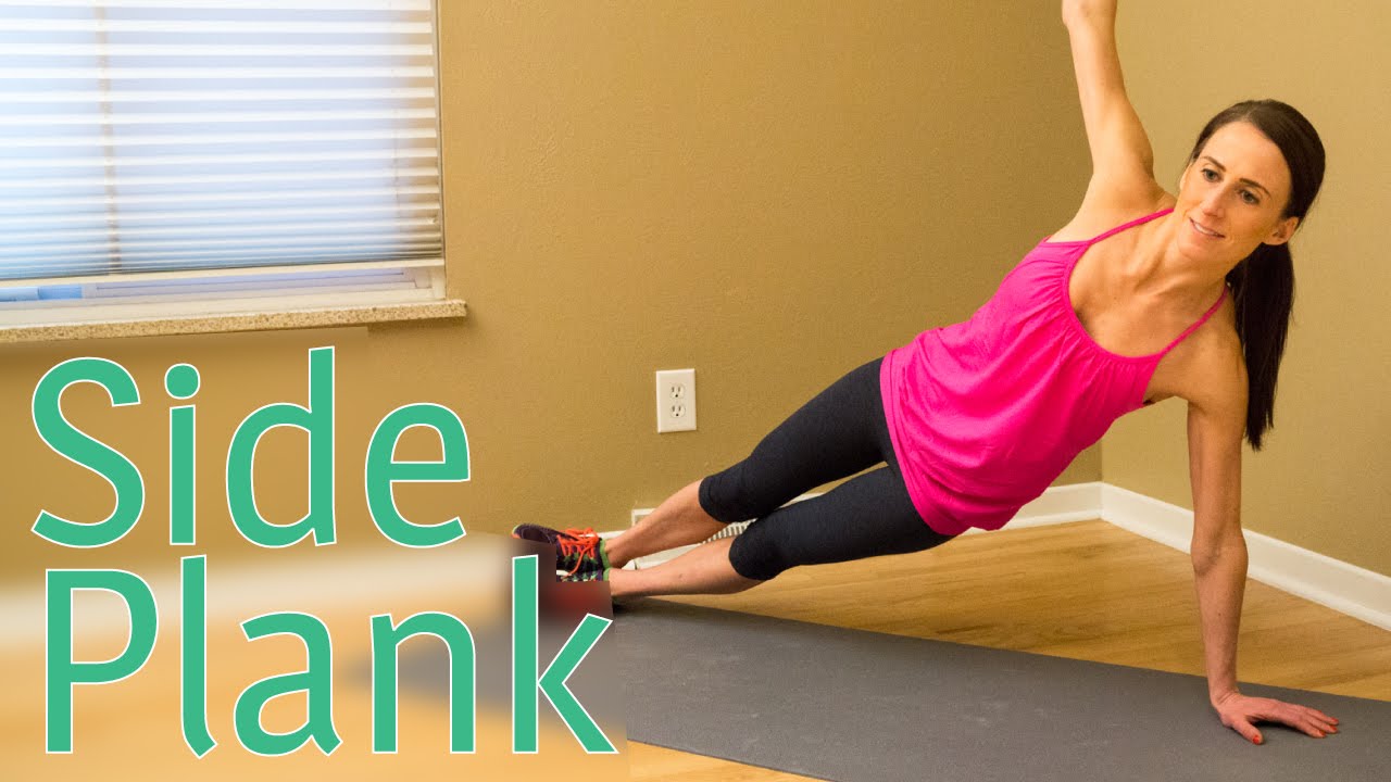 1. Start on your right forearm in a side plank, shoulder directly over elbow, shoulders, hips, and feet stacked.