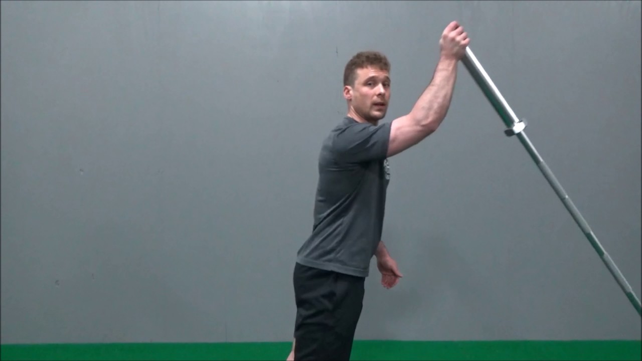 2. Start with one hand firmly gripping the end of the barbell on top of the shoulder (as shown).